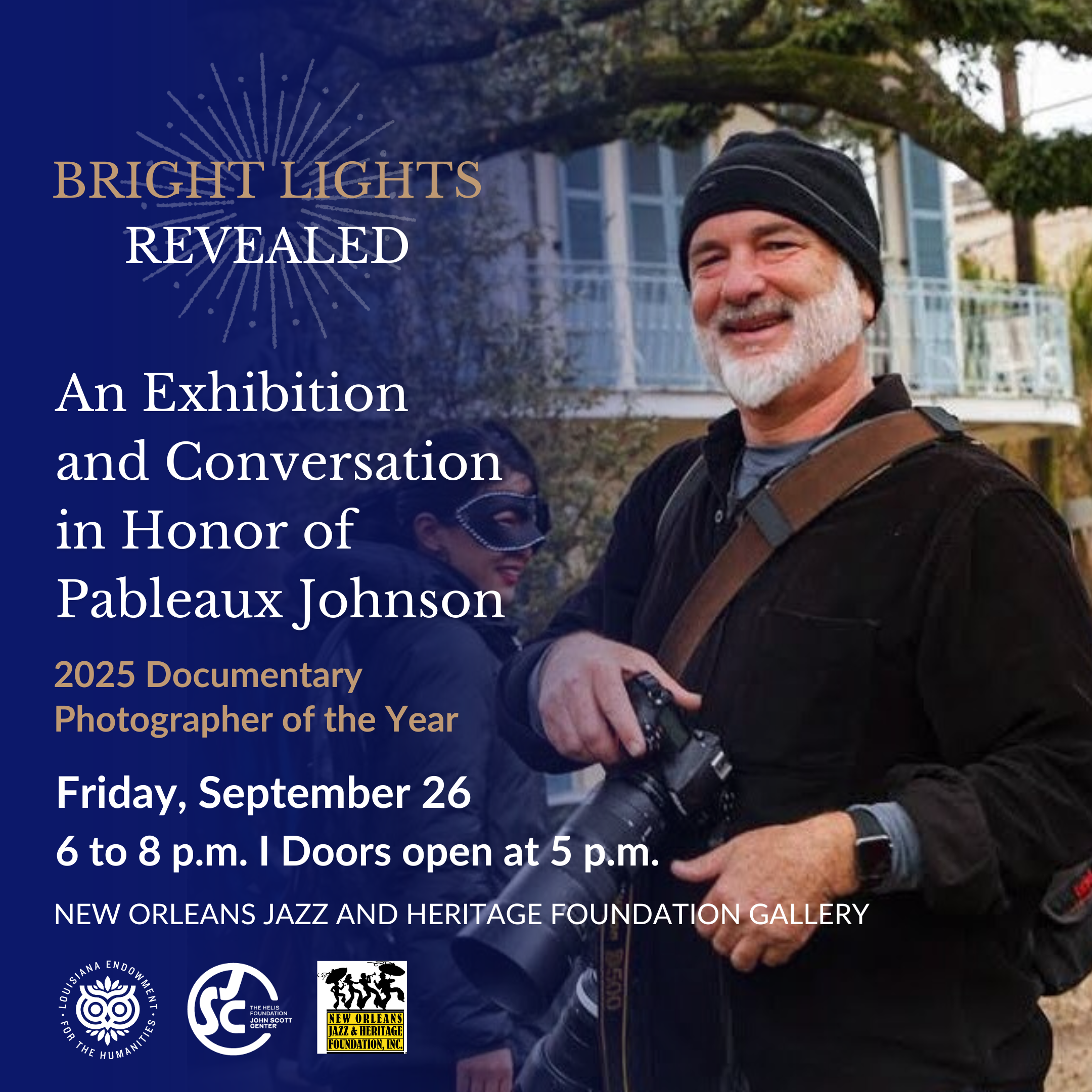 In January 2025, the Louisiana Endowment for the Humanities announced that Pableaux Johnson would receive its Bright Lights Documentary Photographer of the Year award. Only weeks later, he tragically passed away of heart failure while photographing a second line parade organized by the Ladies and Men of Unity. In this Bright Lights Revealed series event, the LEH and the New Orleans Jazz and Heritage Foundation have partnered to display 30 prints taken from Pableaux’s archive and to host a conversation with second line dancers, Mardi Gras Indians, and fellow photographers about his deep connections with the people he photographed. Join us as we honor Pableaux’s legacy through the artistry of his work and celebrate the engaging spirit of the man behind the camera.